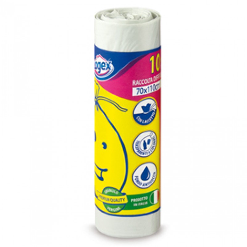 Sacchetti bianchi in polietilene ad alta densità per raccolta differenziata 70x110cm, 16micron, 24gr. Capienza 120 litri. Confezionati in rotolo con fascetta.