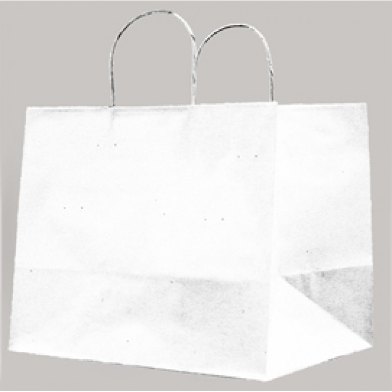 Shopper in carta kraft con maniglia in carta ritorta rinforzata. Il fondo largo rende lo shopper ideale per il trasporto di vassoi e il prodotto e particolarmente indicato per utilizzo nelle pasticcerie e pizzerie d'asporto.