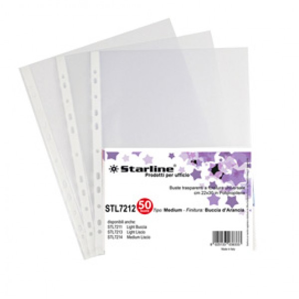 Buste STARLINE con foratura universale rinforzata. Realizzate in polipropilene trasparente finitura a buccia d'arancio antiriflesso. Formato utile 22x30cm.