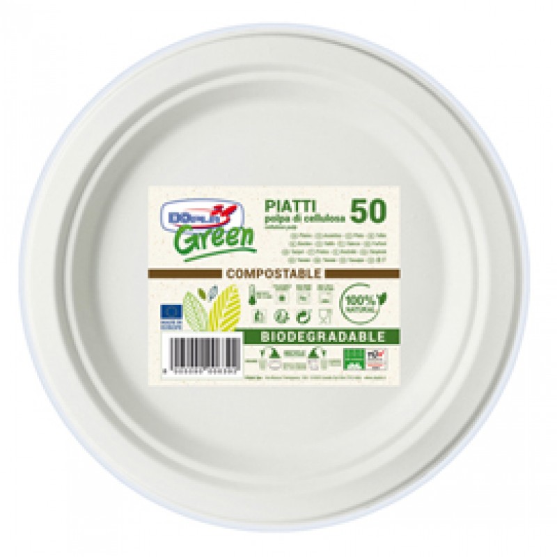 Piatti bianchi realizzati in polpa di cellulosa, compostabile e biodegradabile in conformità alla norma EN 13432. Idonei per essere usati in microonde (max 800w per 2'), in forno (max 90°C per 15') e in congelatore. Idonei al contatto con gli alimenti.