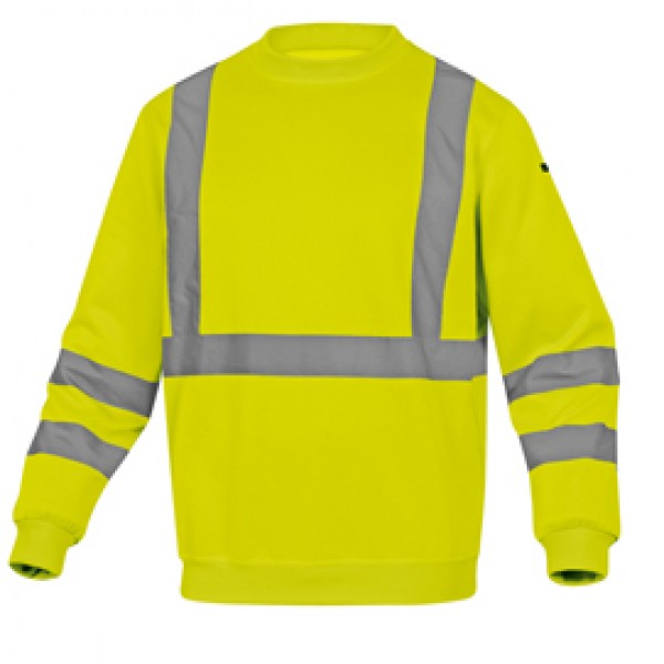 Felpa sportiva con polsini e parte bassa della felpa con bordo a coste. Bande a bretella colore argento. Colore giallo fluo. Categoria DPI: 2. Certificazione CE. Conformità alle norme EN ISO 13688:2013 e EN ISO 20471:2013 /A1:2016.