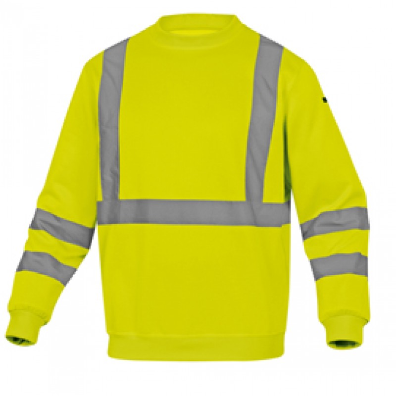 Felpa sportiva con polsini e parte bassa della felpa con bordo a coste. Bande a bretella colore argento. Colore giallo fluo. Categoria DPI: 2. Certificazione CE. Conformità alle norme EN ISO 13688:2013 e EN ISO 20471:2013 /A1:2016.