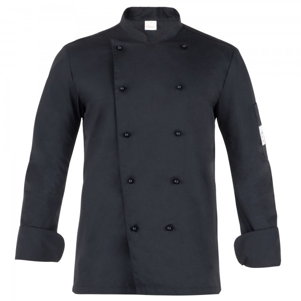 Giacca da cuoco a manica lunga con abbottonatura doppio petto, collo e polsi arrotondati, porta penne sulla manica sinistra. Vestibilità Slim Fit e bottoni estraibili sulla pettorina davanti. Realizzata in tessuto 65% poliestere 35% cotone nella variante nera. Ha la variante manica corta nella giacca Tommaso. Taglie: XS, S, M, L, XL, XXL, 3XL, 4XL, 5XL