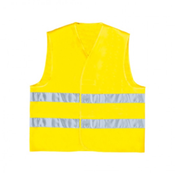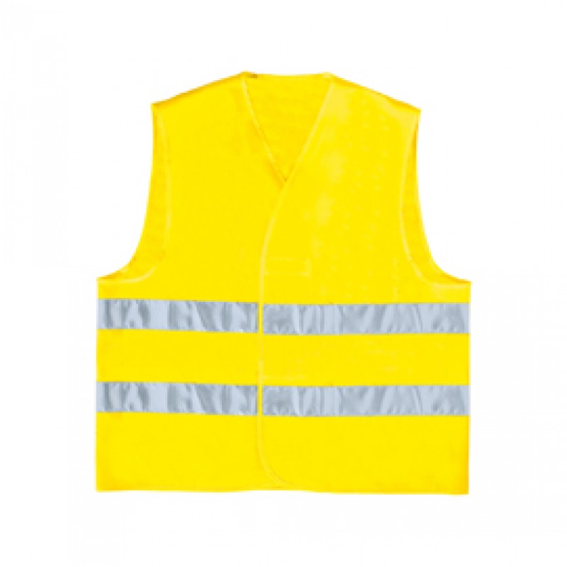 Gilet in poliestere con chiusura mediante fascia auto-stringente. Strisce retro-riflettenti cucite. Categoria DPI: 2. Certificazione CE. Conformità alle norme EN ISO 13688:2013 e EN ISO 20471:2013 /A1:2016.