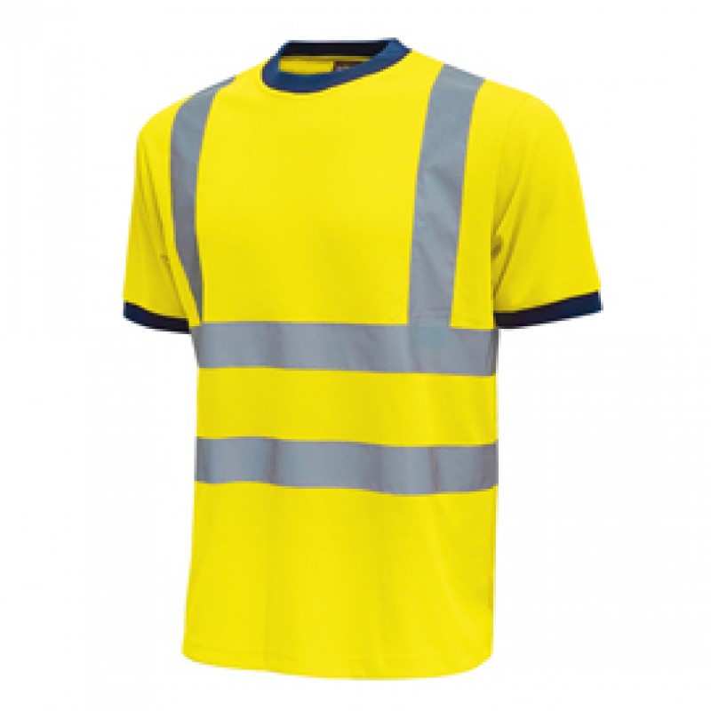 T-Shirt con strisce riflettenti applicate. Collo e bordo manica in costine elasticizzate in colore blu. Fettuccia parasudore. La composizione del tessuto garantisce una buona traspirabilità aumentando il comfort. Conformità alle norme EN ISO 13688:2013 e EN ISO 20471:2013+A1:2016.