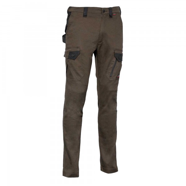 2 ampie tasche anteriori, doppia tasca posteriore con pattina chiusa con snap, passante portamartello, taglio ergonomico di gambe e ginocchia, tasca laterale destra chiusa con snap, tasca laterale sinistra con doppia apertura (chiusa con snap e con zip), tessuto ad elevata percezione elastica