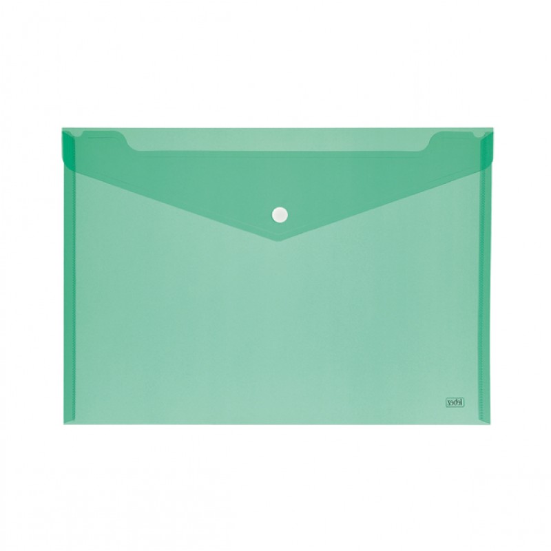 Buste in polipropilene con chiusura con bottone. Confezione assortita in 4 colori. Formato utile: 24x18,5cm.