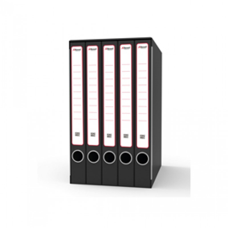 Sistema di archiviazione King Mec composto da un'unica custodia con 6 cartelline a 2 anelli (dorso 3,3 cm; formato utile LxH 23x33 cm). Struttura in robusto cartone grigio rivestito con carta goffrata nera antimpronta. Custodia in tinta con parabordi. Anello di estrazione in acciaio. Etichetta adesiva già posizionata sul dorso. Ideale per raggruppare fogli perforati. Dimensioni esterne 23,5x25x35 cm.