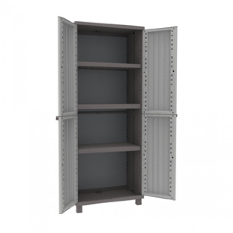 Linea di armadi modulari con robusta struttura in PPL ed elegente finitura legno color tortora. Gli armadi hanno ante apribili a 180° e ripiani regolabili. Piedini rialzati e predispozizione per il lucchetto. Adatto sia per ambienti interni che esterni. Armadio a 2 ante con 3 ripiani regolabili. L68 x P37,5 x H170cm.