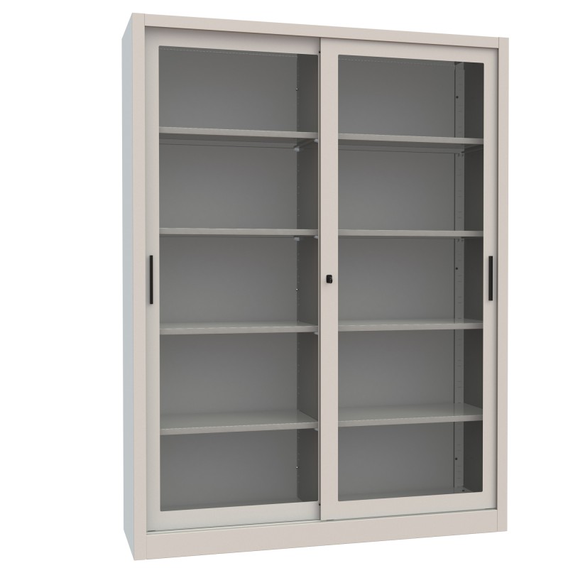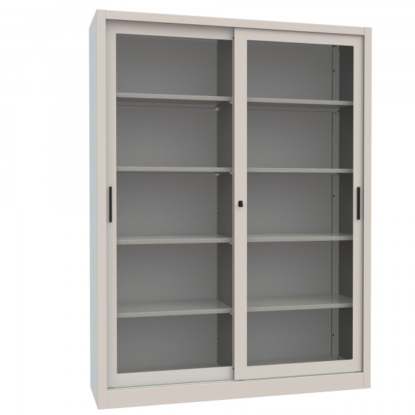 Armadio Ante Scorrevoli Vetrate fornito smontato. Dimensioni (LxPxH ): 1500x450x2000mm. Dimensioni vano (LxPxH): (724x2)x380x1900mm. Base su zoccolo in acciaio, h.80 mm. Corpo formato da pannellature a incastro spessore 8/10,e viti di fissaggio, fondo,cappello, schiena ,fianchi con cremagliere spessore frontale 40mm con bordi raggiati. Ante scorrevoli in cristallo temperato su cuscinetti inferiori e superiori con pieghe antitaglio su quattro ordini e rinforzo centrale. Maniglia in materiale plastico colore nero.