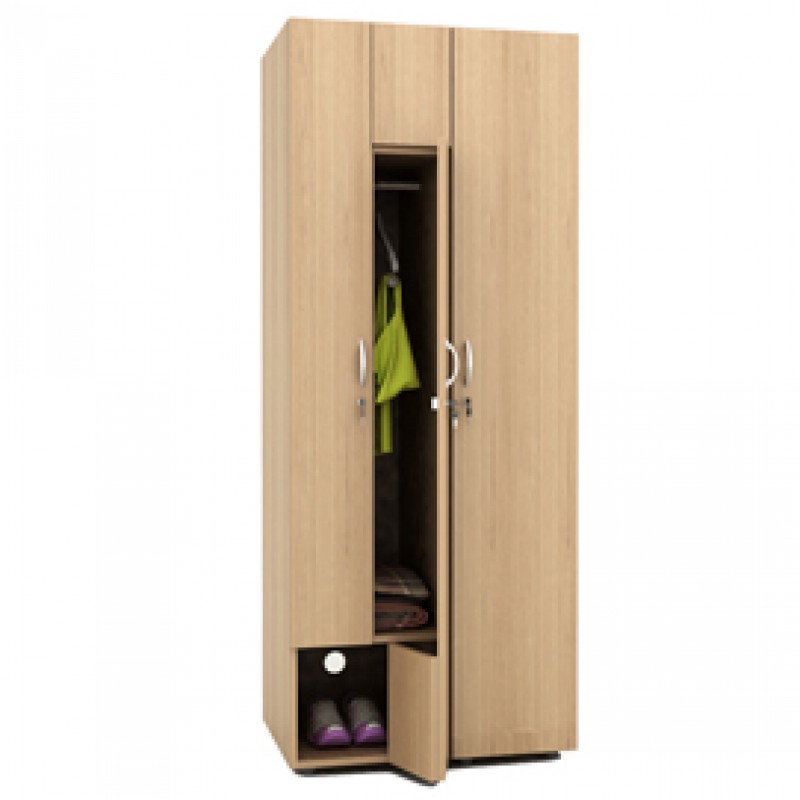 Mobile guardaroba/spogliatoio a 2 ante ognuna con serratura. In materiale melaminico classe E1 con finitura antigraffio e antiriflesso. Ogni anta chiude un vano piccolo (dimensioni utili: 36,4x48xH28cm) e un vano grande (dimensioni utili: 17,3x 48xH118,8cm) completo di asta appendiabiti. Dotato di fori per una perfetta aerazione posteriore e piedini regolabili in altezza. Le cerniere laterali sono provviste di un meccanismo scorrevole che permette l’apertura contemporanea del vano superiore con l'anta sinistra e del vano inferiore con l'anta destra.