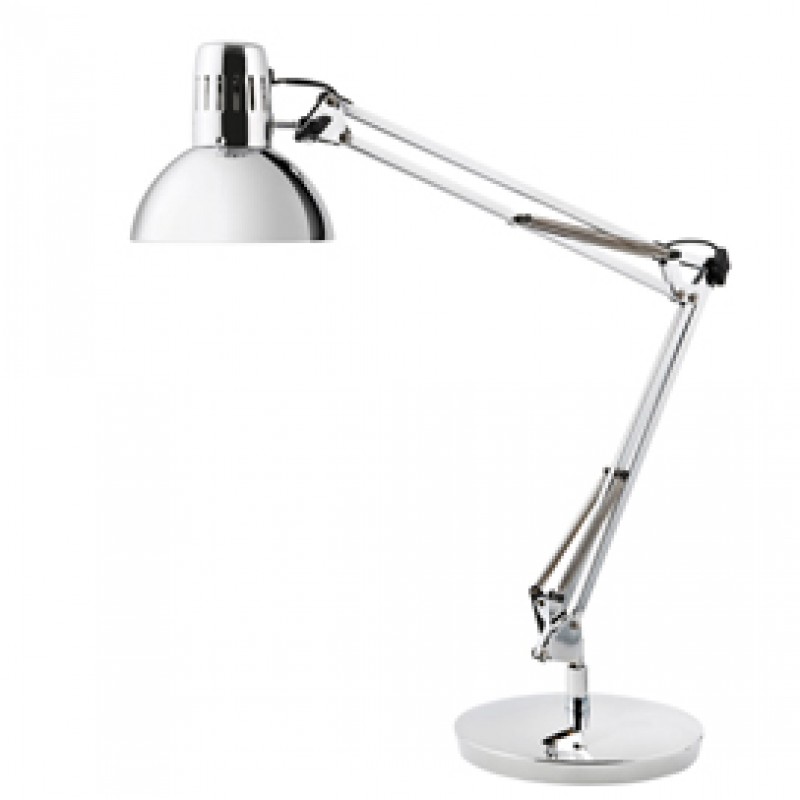 Realizzata in acciaio cromato (non verniciato silver), dotata sia di base che di morsetto per la massima versatilità. Testa diametro 16,5cm braccia 39cm + 42cm. Base diametro 20cm. Lampada LED 7W (inclusa). Attacco E27.