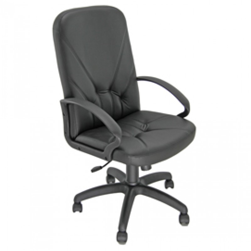 Poltrona in similpelle nera con schienale medio. Braccioli e base con ruote in nylon. Meccanismo oscillante con blocchi. Schienale fisso ed elevazione a gas. Rivestimento seduta in tessuto "PLUS - Eco leather" idrorepellente, facile da pulire, senza flatati e flame retardant.
