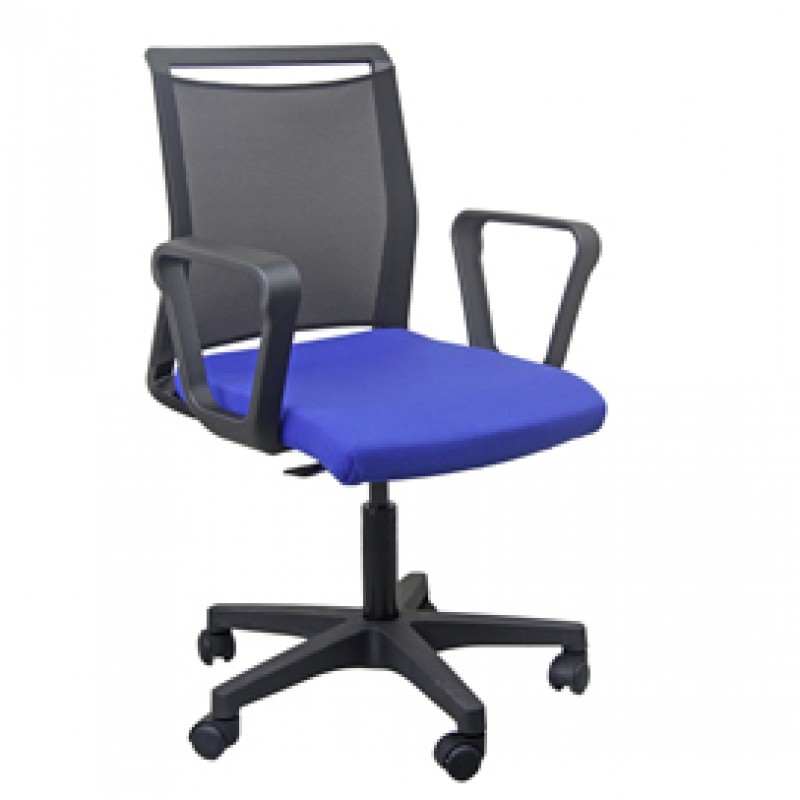 Seduta operativa girevole con schienale in rete nera e seduta rivestita in polipropilene. Base in nylon, elevazione a gas. Braccioli inclusi. Ideale per smartworking.