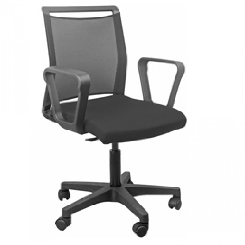 Seduta operativa girevole con schienale in rete nera e seduta rivestita in polipropilene. Base in nylon, elevazione a gas. Braccioli inclusi. Ideale per smartworking.