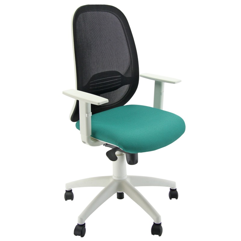 Sedia girevole su ruote con sedile in rete portante e schienale in rete nera, elevazione a gas. Supporto lombare regolabile, meccanismo syncro tra sedile e schienale, a contatto permanente. Rivestimento seduta in tessuto "SUPER-Target" 100% poliestere, idrorepellente e antimacchia, reazione al fuoco classe 1. Completa di braccioli regolabili. Alt.tot: 102-113cm; Prof.tot: 68cm; Alt.schienale: 60cm; Largh.schienale:48cm; Largh.sedile: 48cm; Prof.sedile: 46cm; Alt.sedile: 42-54cm.