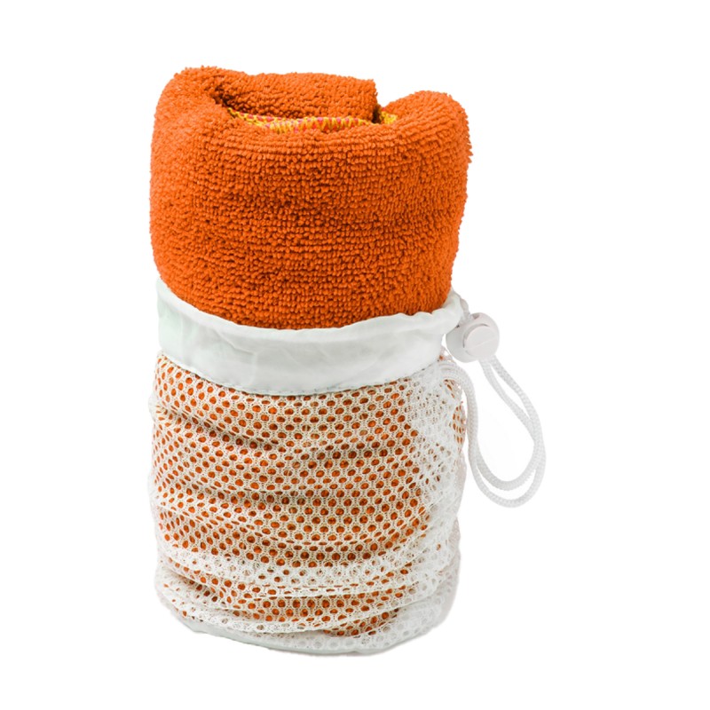 Asciugamano in morbida e assorbente microfibra 185 g/m2. Fornito in pratica custodia a rete con chiu..