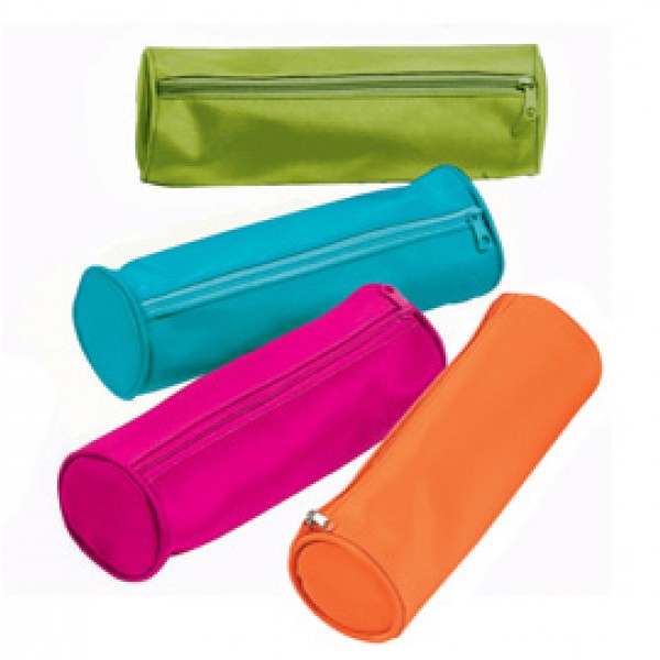 Astuccio con cerniera colorata in nylon resistente e leggermente satinato con bordo rinforzato. L'interno è foderato per una maggiore resistenza allo strappo. Colori assortiti: arancione, viola, verde chiaro, azzurro e rosa.