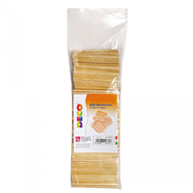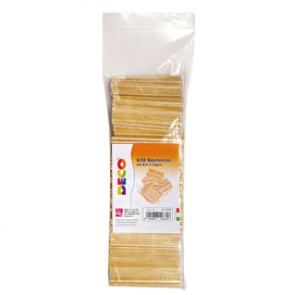 Bastoncini in legno naturale perfetti per realizzare lavoretti e decorazioni. Possono essere dipinti e incollati con facilità. Busta da 650 pz, dimensioni 86x3x3mm.