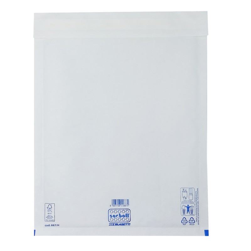 Sacco in carta bianca certificata FSC imbottito con pluriboll. Polietilene a bolle. Termosaldato su tre lati.Lembo autoadesivo protetto da Strip