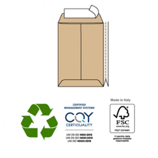 Busta a sacco Multi Strip Large - soffietti laterali - strip adesivo - 19 x 26 x 4 cm - 100 gr - carta riciclata FSC - avana - Pigna Envelopes - conf. 250 pezzi