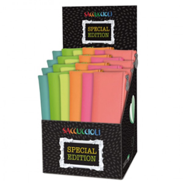 Espositore da banco con 24 bustine c/zip, dim. 21x6cm, colori assortiti in 6 versioni fosforescenti.