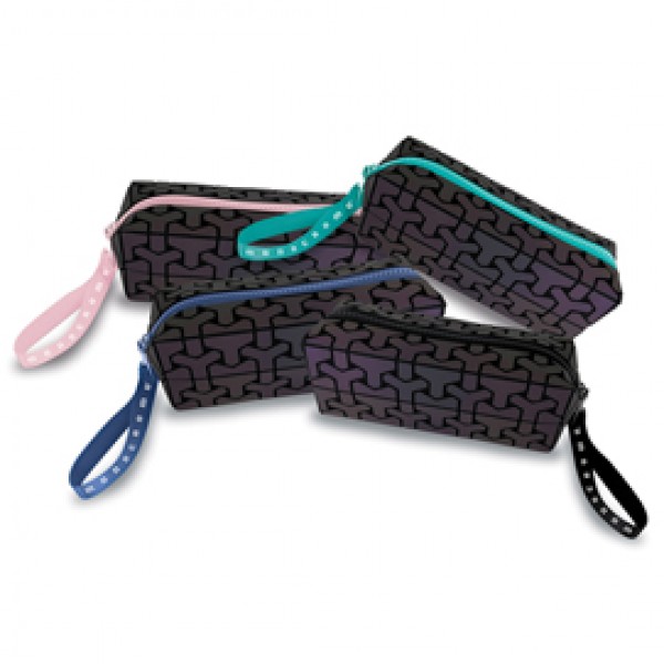 Astuccio rettangolare con superficie riflettente. Dotato di cerniera in 4 colori assortiti.(verde, rosa, nero e blu). Dimensione: 60x200x60mm