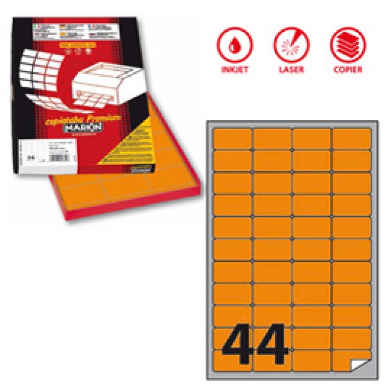 Etichetta adesiva A406 - permanente - 47,5x25,5 mm - 44 etichette per foglio - arancio fluo - Markin - scatola 100 fogli A4