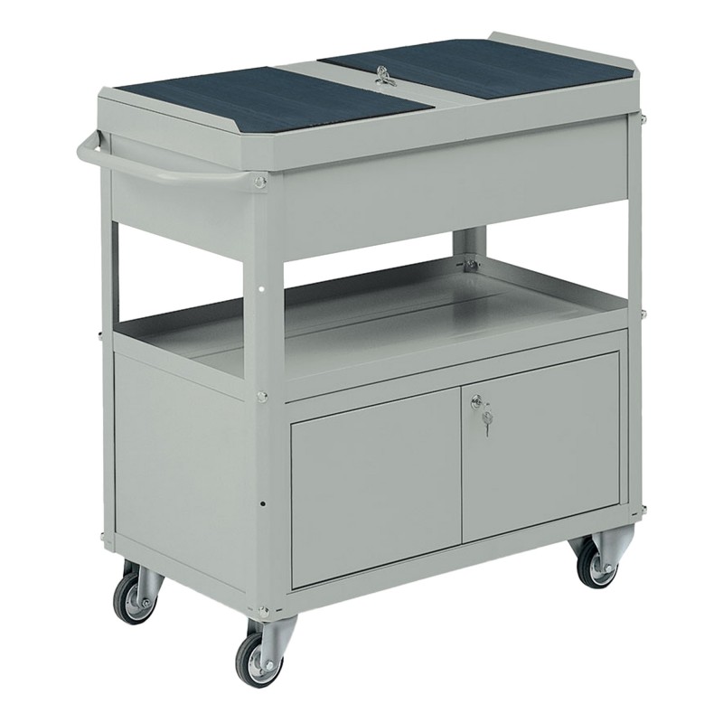 Carrelli smontabili portautensili con portattrezzi superiore con 2 coperchi scorrevoli con serratura e gomma antiscivolo e antiolio spessore mm. 2. Vaschetta fissa di mm. 795 x 418 e vaschetta scorrevole su cuscinetti di mm. 390 x 420 x 60 h., fessurate con passo mm. 64 e corredate di 4 separatori longitudinali asolati e 5 trasversali lisciVerniciatura a polvere grigio RAL 7038.