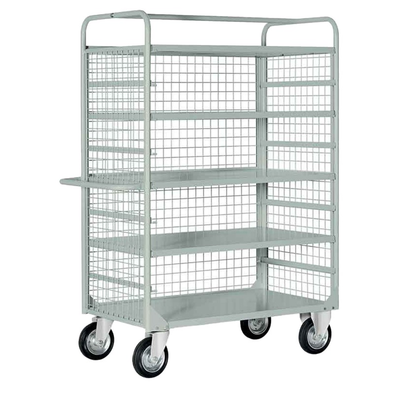 Carrello in lamiera a 4 piani estraibili, sponde in rete con maglia 5x5x0,4cm su 3 lati, manico e 1 piano fisso. Ruote 20cm con cuscinetti, 2 fisse e 2 girevoli. Portata 450kg. Verniciatura a polvere grigio RAL 7038. Ideale per lo spostamento rapido e in sicurezza di merce ingombrante, scatole o oggetti di dimensioni più contenute tra uffici interni, magazzini e punti vendita. Dimensioni carrello: 132Lx67Px177Hcm. Dimensioni pianale: 110Lx65Hcm. Fornito smontato.