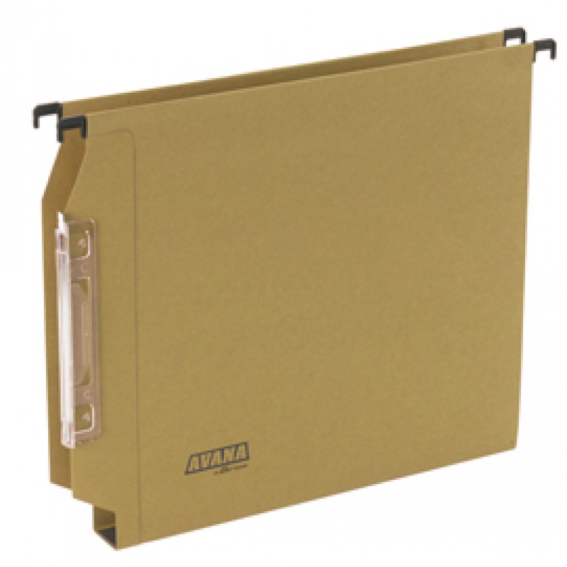 Linea economica e di alta qualitÓ. Realizzate in cartone avana termoincollato 220g. Aste di sospensione in filo dÆacciaio. Portacartellino ad effetto lenticolare da 14cm. Sistema di collegamento ad incastro. Formato esterno 32,6x27,5cm. Interasse 33cm. Fondo U da 3cm. Confezione da 50cartelle.