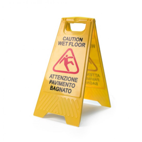 Cartello a cavalletto in plastica antiurto con segnalazione bilingue "pavimento bagnato" - "wet floor". Dimensioni: L30cm x H62cm