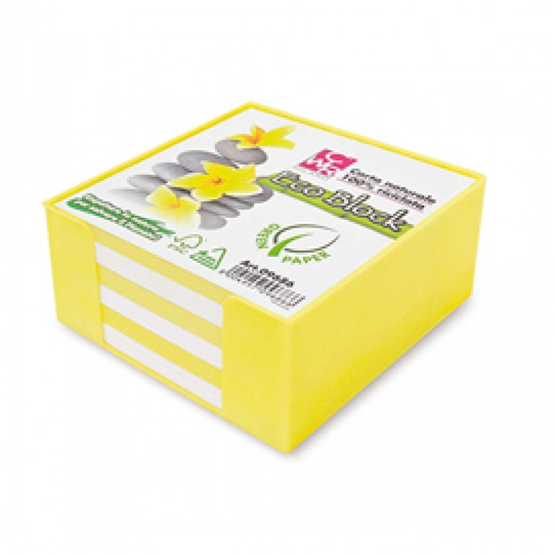 Contenitore in plastica con foglietti in carta riciclata. Dimensione 10x10x5cm. Carta colorata.