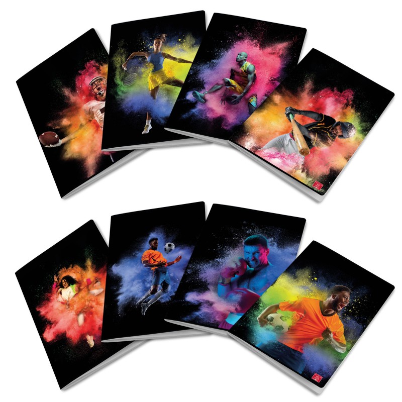 Maxiquaderno rilegato con punto metallico. Copertina in cartoncino da 205gr verniciatura UV. Risguardo personalizzabile stampato fronte e retro. Fantasie assortite 2023.