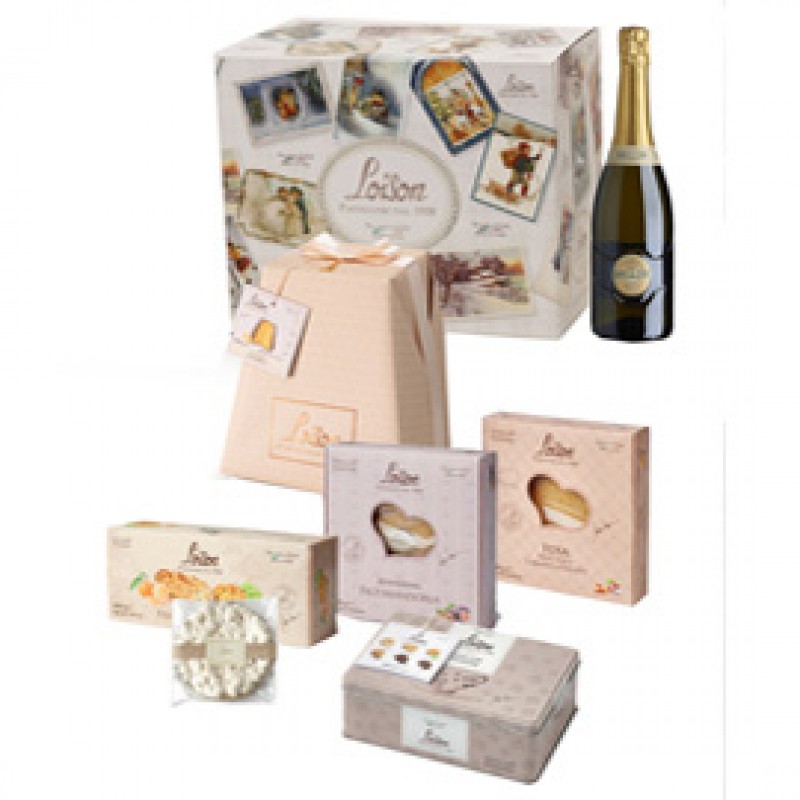 Scatola Bianco Natale rettangolare in cartoncino verde (con cartone esterno). Contiene: - Pandoro linea top classico collezione Genesi, 1000g; - Bottiglia di vino Recioto di Gambellara DOCG 75cl; - Filone albicocca basilico in astuccio 500g; - Bonissima Ficomandorle con miele Millefiori di Sicilia, fico dottato di Calabria e mandorle "Tuono" italiane in astuccio da 300g; - Torta Tosa a base di crema al caramello salato e nocciole piemontesi in astuccio da 300g; - Scatola in latta biscotti monodose gusti classici, 280g; - Cuneesi con croccante guscio al cioccolato e un morbido ripieno nelle varianti Rhum, Whisky e Grand Marnier, 250g.