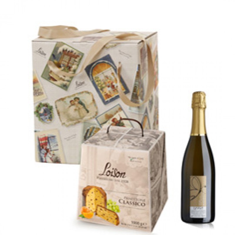 Scatola in cartoncino verde, fantasia cartoline natalizie, con maniglie in cotone (con cartone esterno). Contiene: Panettone classico in astuccio linea Tuttigiorni, 1000 g - Bottiglia di vino Spumante Moscato Dolce Nani 75cl.