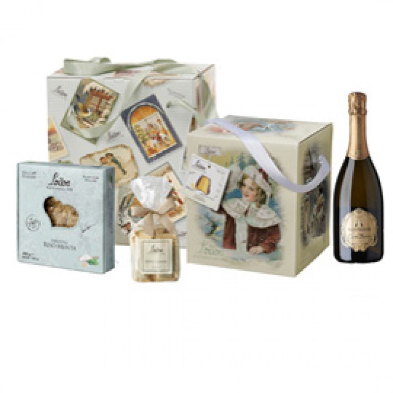 Scatola in cartoncino color indaco con fantasia natalizia. Contiene: Pandoro classico linea top collezione Foresta, 1000gr; Bottiglia di vino Spumante Pinot Brut Nani tenuta Castello di Rubano 75cl; Nocciolotti croccanti con nocciole intere del Piemonte ricoperte di cioccolato fondente e al latte in confezione regalo 150gr; Sbrisola Nocciola Ciocco con farina di mais Marano, arricchita con nocciole Piemonte IGP e gocce di cioccolato fondente, in astuccio da 200gr.