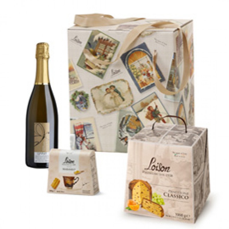 Scatola in cartoncino avorio, fantasia cartoline natalizie, con maniglie in cotone (con cartone esterno). Contiene: - Pandoro classico in astuccio linea Tuttigiorni, 1000g; - Bottiglia di vino Spumante Cuvée Extra Dry Royale Montresor 75cl; - Biscotti Canestrello, in astuccio 200g.