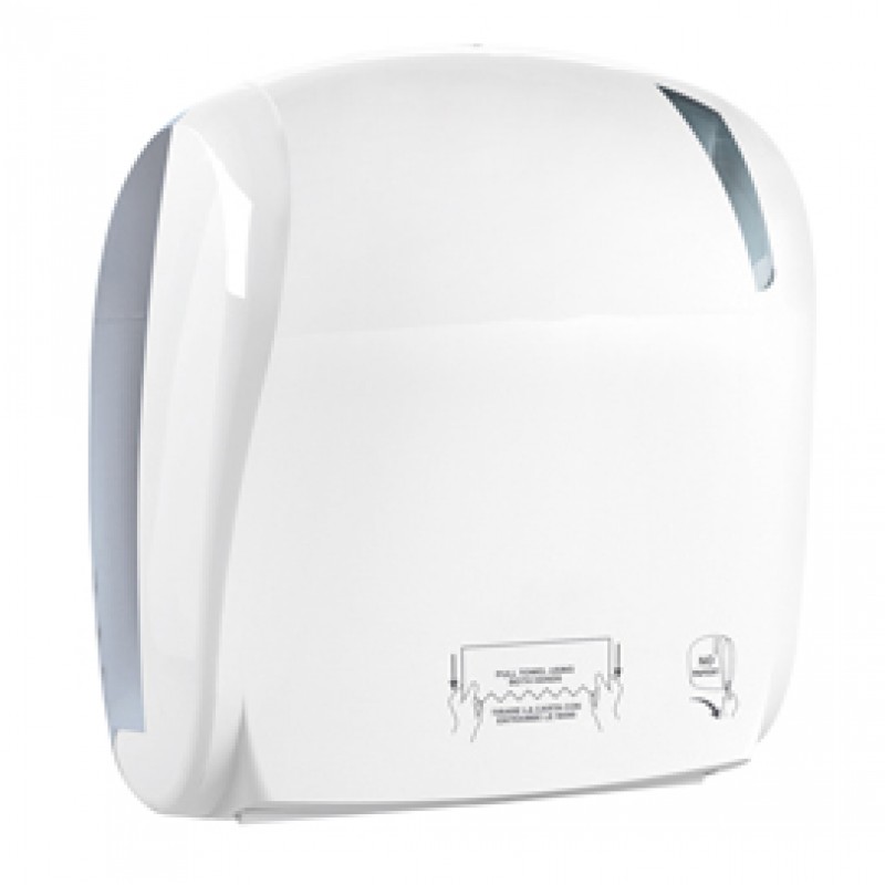 Dispenser a taglio automatico per carta asciugamani in rotolo autocut. La carta viene tagliata automaticamente dal dispenser. Il meccanismo non ha nessun dispositivo elettrico. Ad ogni strappo il dispenser eroga un lembo di carta di circa 27 cm. Cover in ABS, utilizzo gradevole e silenzioso. Fornito con viti e tasselli per fissaggio a muro. Dimensioni: L33 x P22,1 x H 37,1cm - per rotoli Ø max 19cm.