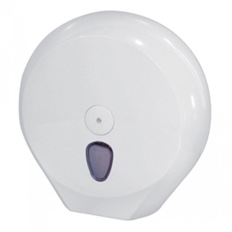 Distributore per carta igienica in rotolo in versione Maxi, è possibile vedere la quantità di carta rimasta grazie alla trasparenza a goccia sulla parte frontale del dispenser.