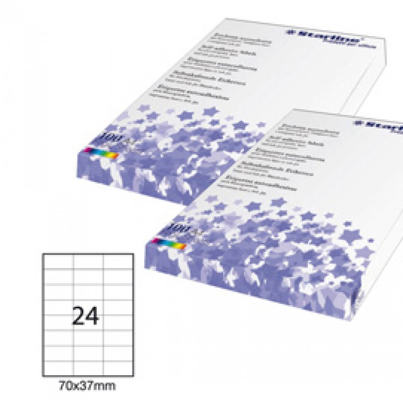 Etichette adesive bianche STARLINE utilizzabili con stampanti laser, inkjet o fotocopiatori. Adesivo permanente. Prive di margne di sicurezza lungo il perimetro. In scatola da 100 fogli formato A4.