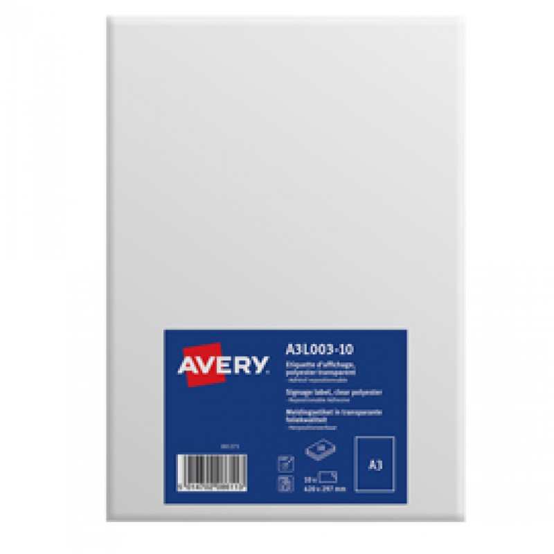 Etichette in poliestere - rimovibili - autoaderenti - A3 - 1 etichetta per foglio - trasparente - Avery - conf. 10 fogli
