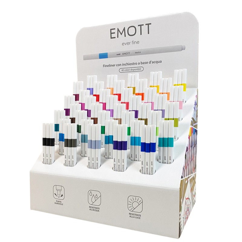 Espositore da banco con 120 fineliner Emott tratto 0.4mm. Inchiostro a base d'acqua e dal design innovativo. Assortimento in 40 eleganti colori.