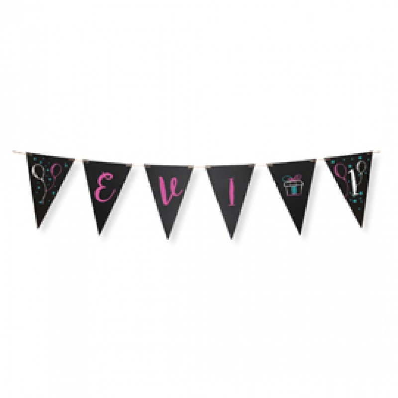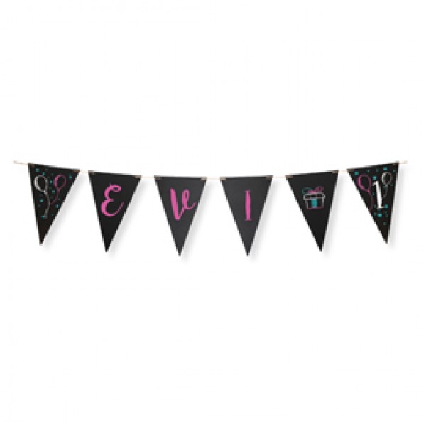 Festone formato da 14 bandierine lavagna (formato 22x15cm ciascuna), ideali per personalizzare la festa con messaggi sempre nuovi e divertenti. Fornito con pennarello a gesso liquido e filo da 4 metri.
