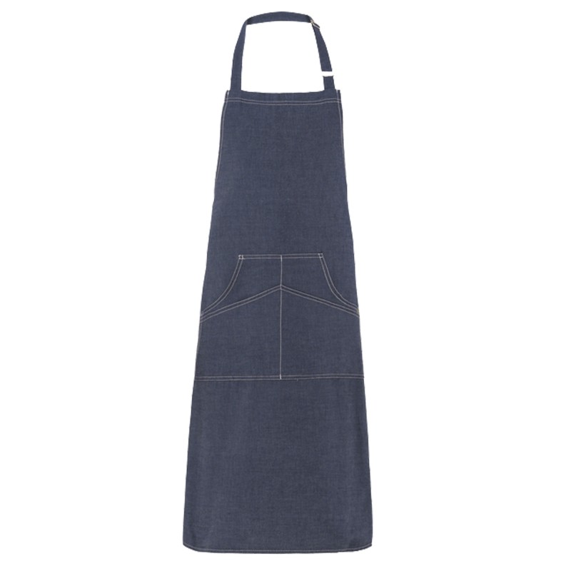 Grembiule Chicago finitura jeans con 4 tasche e allacciatura collo regolabile con fibbia. Colore: blu jeans. Taglia unica. 98% cotone e 2% elastan.