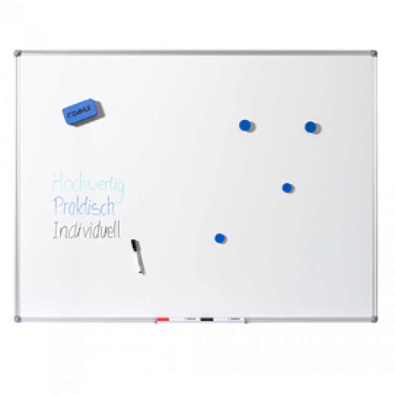 Lavagna bianca con superficie in acciaio laccato, magnetica, scrivibile e cancellabile con marcatori a secco. Robusta cornice in alluminio estruso di alta qualità con angoli in plastica per la massima stabilità. Completa di vassoio porta accessori da 30cm e kit di montaggio.