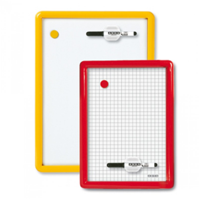 Lavagna magnetica con cornice in plastica colorata, superficie metallica bianca. Accessori: pennarello, fermafogli e cancellino magnetico.