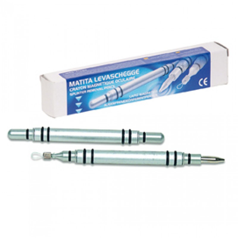 Strumento per la rimozione di schegge di metallo negli occhi. Dotato da un lato di una punta magnetica in NEODIMIO, di eccezionale forza di attrazione, che permette la rimozione di schegge ferrose evitando di avvicinare pericolosamente la punta al bulbo oculare. Nell'altro lato un' asola in nylon antiabrasione permette la rimozione di schegge di altra natura. Il corpo ed il supporto degli strumenti sono in alluminio anodizzato.Le guarnizioni in neoprene garantiscono una presa sicura della matita. Fornita in pratico astuccio, dotata di marcatura CE.