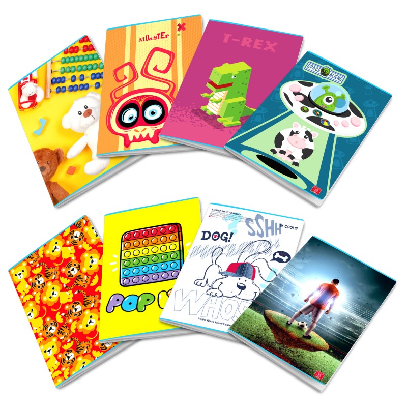 Maxiquaderno rilegato con punto metallico. Copertina in cartoncino da 205gr verniciatura UV. Risguardo personalizzabile stampato fronte e retro. Fantasie assortite 2023.