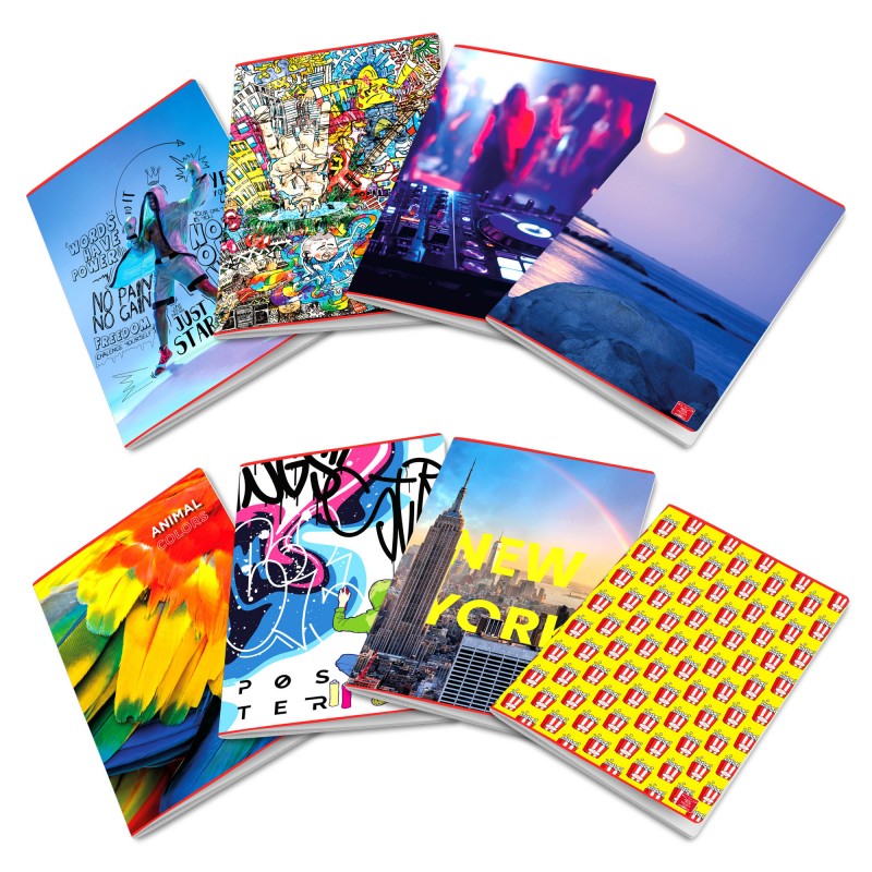 Maxiquaderno rilegato con punto metallico. Copertina in cartoncino da 205gr verniciatura UV. Risguardo personalizzabile stampato fronte e retro. Fantasie assortite 2023.